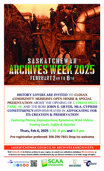The Climax Community Museum invites History Lovers to an Open House and special presentation on the opening of Cypress Hills Park, Saskatchewan focusing on "The role of J.E. Gryde, MLA, Cypress Constituency (1929-1934) played in advocating for its creation and preservation."