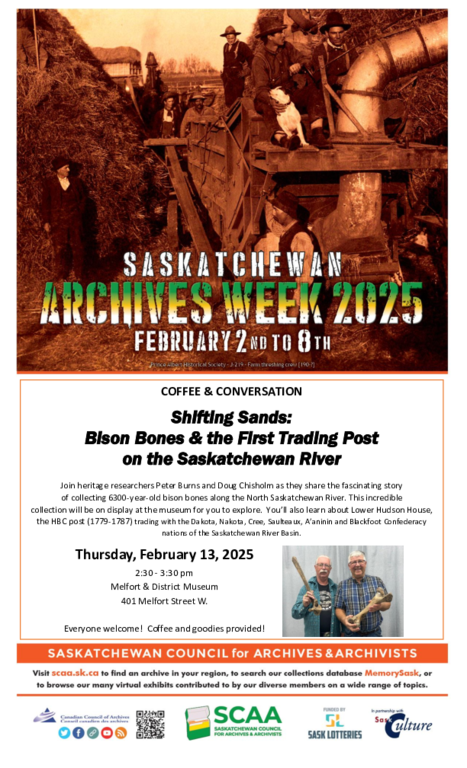 Join heritage researchers Peter Burns and Doug Chisholm as they share the fascinating story of collecting 6300-year-old bison bones along the North Saskatchewan River. This incredible collection will be on display at the museum for you to explore. You’ll also learn about Lower Hudson House, the HBC post (1779-1787) trading with the Dakota, Nakota, Cree, Saulteaux, A’aninin and Blackfoot Confederacy nations of the Saskatchewan River Basin.
