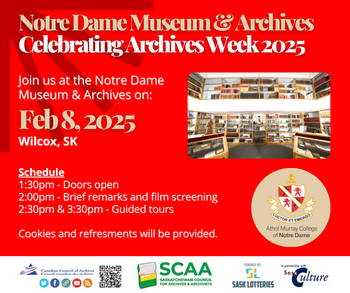 Come join us in Wilcox at the Notre Dame Museum & Archives on Saturday, February 8th from 1:30pm - 4:00pm, as we celebrate Saskatchewan Archives Week 2025. Explore Athol Murray College of Notre Dame's rich history and learn more about our founder Father "Père" Athol Murray. Enjoy captivating storytelling, take part in guided tours, and discover our rare book collection. This event is open to all, and we’d love to have you there!