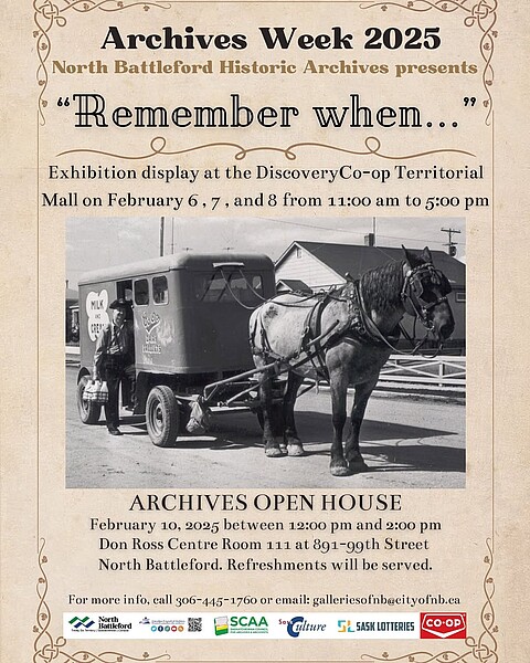 The City of North Battleford Historic Archives will set-up a display for Archives Week at the Discovery Co-op Mall from February 6, 7, 8 from 11am-5pm. Their topic for this year is "Remember when...".